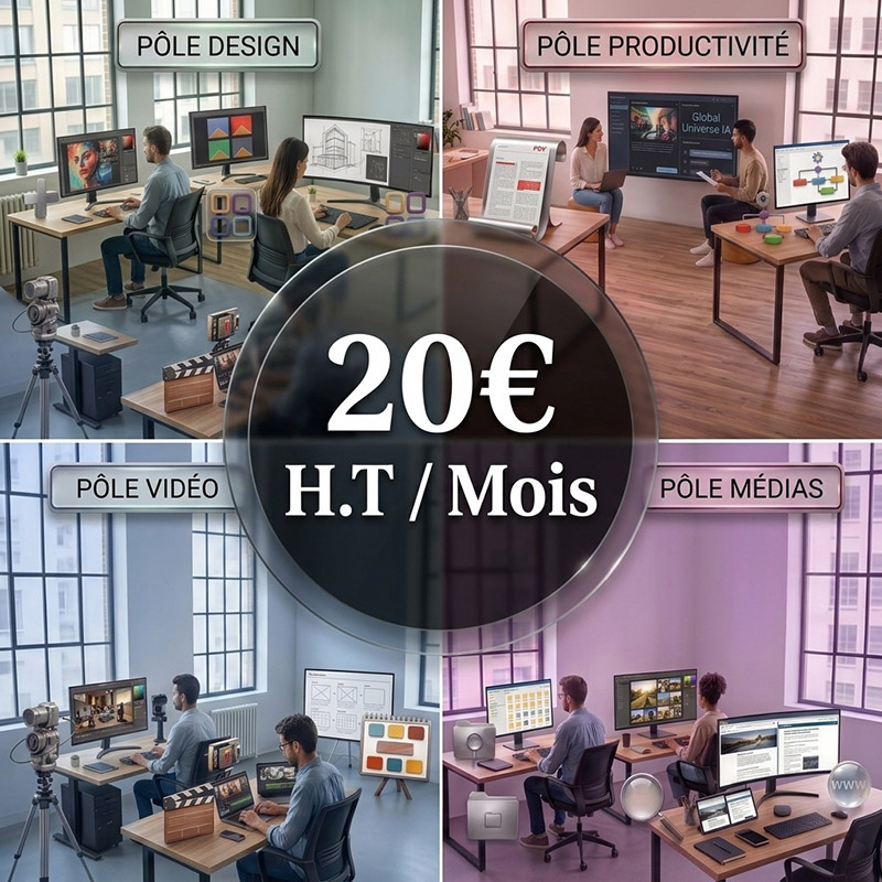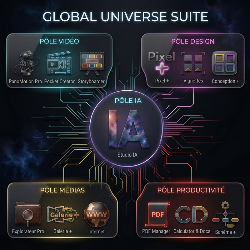 Global Universe IA centralise le Design, la Productivité, la Vidéo et la Gestion Média dans une interface unique boostée par l'Intelligence Artificielle. Libérez votre potentiel, pas votre budget.