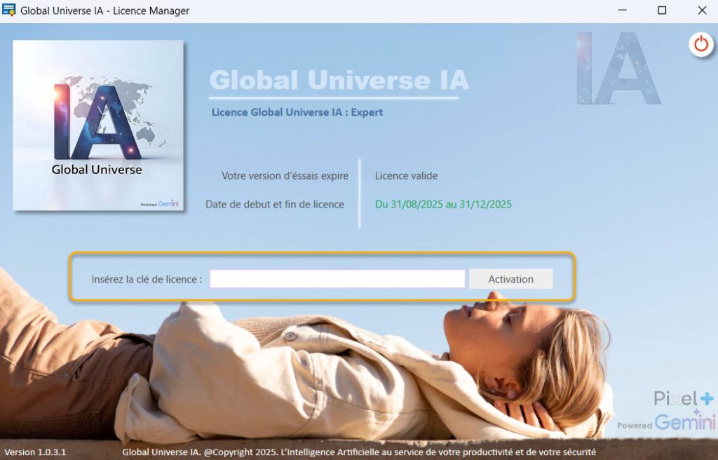 Une fois l’installation terminée, vous devez activer votre licence pour commencer à utiliser Global Universe IA en version abonnement.