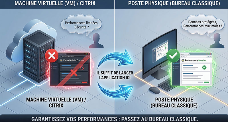 Vous utilisez actuellement une machine virtuelle ou un environnement Citrix ? Notre application n’étant pas compatible avec ces environnements, il vous suffit de la relancer directement depuis votre poste de travail physique.