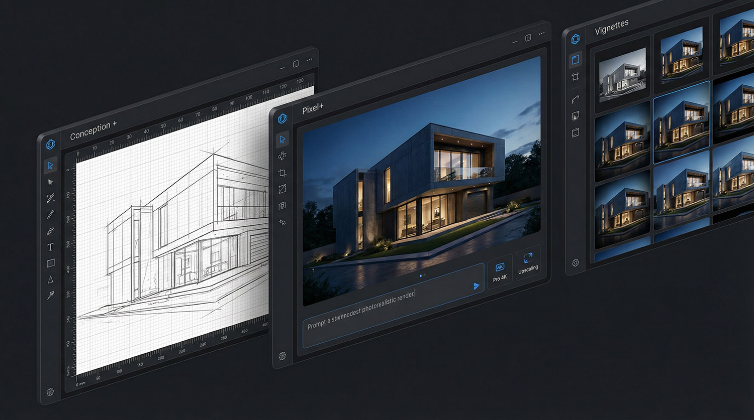 Cette fonctionnalité incroyable présent dans Pixel+, c’est tout simplement la capacité de passer d’un schéma conceptuel basique (ou un dessin vectoriel) à un rendu photoréaliste de haute qualité. C’est le « Saint Graal » pour les architectes, les designers et les créatifs, car cela résout le problème du « syndrome de la page blanche » tout en gardant le contrôle sur la composition.